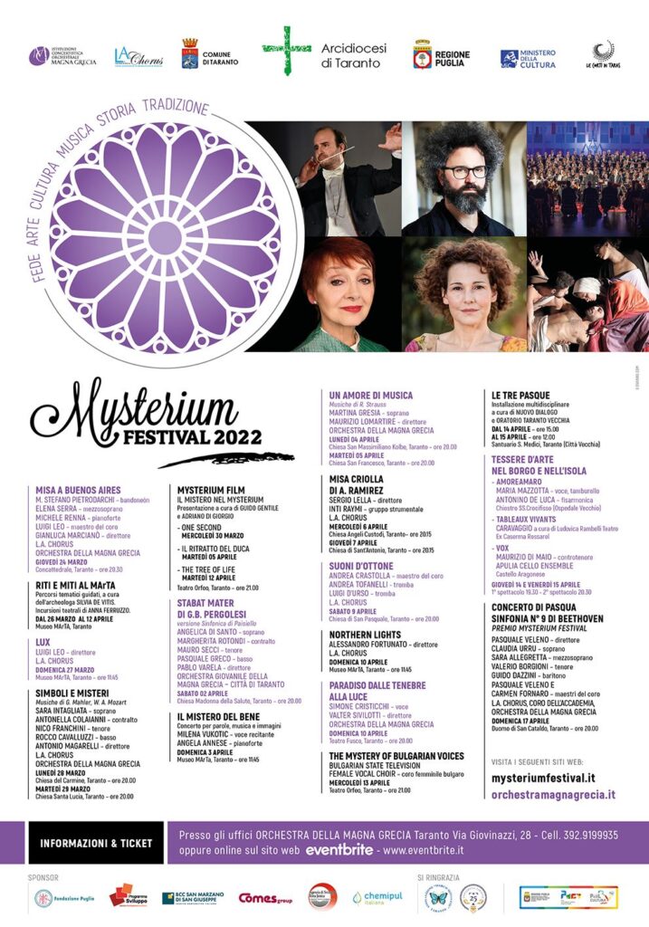 «Il Mysterium torna all’interno della Quaresima – dice Piero Romano, direttore artistico dell’Orchestra Magna Grecia – e vicino ai Riti della Settimana Santa e alla Santa Pasqua: partiamo, come da tradizione, dalla Concattedrale Gran Madre di Dio con “Misa a Buenos Aires” con la direzione di Gianluca Marcianò per concludere con il Concerto di Pasqua, la Nona sinfonia di Beethoven diretta da Pasquale Veleno; fra i due eventi, altri appuntamenti, fra questi: Simone Cristicchi al Fusco, Milena Vukotic e Anna Ferruzzo al MArTA, una installazione dedicata alla Pace; appuntamenti nei quartieri di Taranto per una città che vibrerà insieme alla musica».